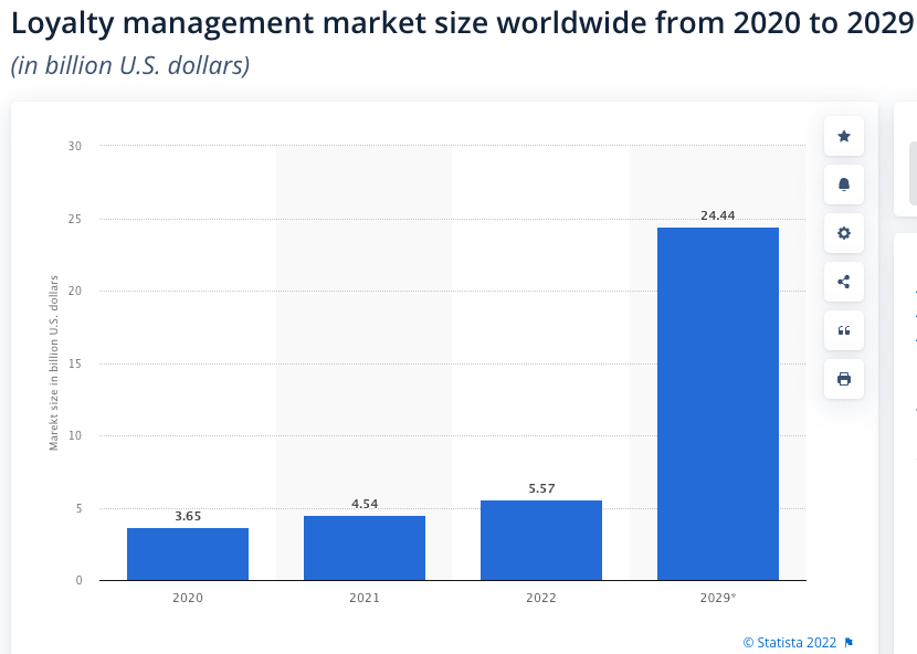 Statista forecasts the global loyalty management market size to grow from USD 4,54 billion in 2021 to USD 24,4 billion by 2029, at a CAGR of 16.3% during 2021 –2029. Major growth drivers for the market include increasing adoption of omnichannel and multi-channel programs, technological advancements, and a growing need for competitive differentiation.
