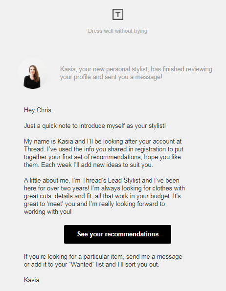 As and example, Thread sends personalized emails, signed by it’s Lead Stylist, suggestion fashion items that will most certainly appeal to specific clients: